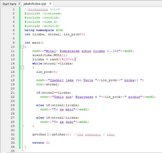 Zgadnij, jaka to liczba to program, w którym użytkownik zgaduje liczbę od 1 do 100 wylosowaną przez program. Podczas zgadywania program informuje, czy liczba jest większa czy mniejsza. Podczas gdy użytkownik wprowadzi wylosowaną przez komputer liczbę - program się kończy.